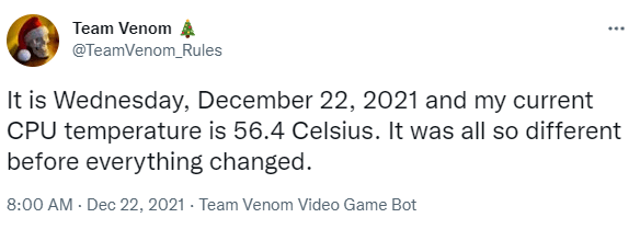 To celebrate this monumental occasion I’ve added another type of Python script twitter bot post to the Team Venom account. Using the “vcgencmd measure_temp”, “date”, and classic linux “fortune” commands (/opt/vc/bin/vcgencmd measure_temp, date ‘+%A, %B %d, %Y’, and /usr/games/fortune) I can pull the CPU temp, current date, and random “fortune” and post it to twitter as seen below: